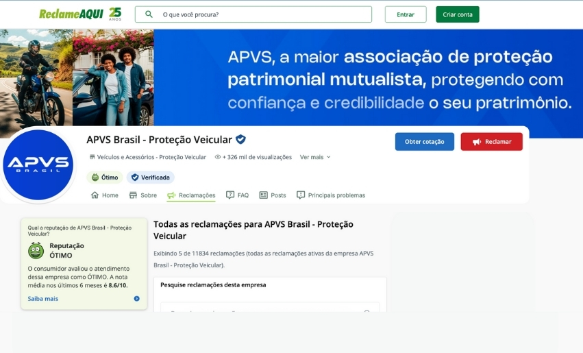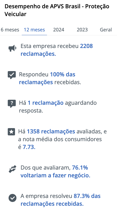 *Todos os dados do Reclame Aqui referem-se à associação nacional A P V S – Proteção Veicular.